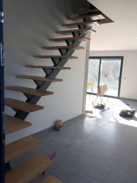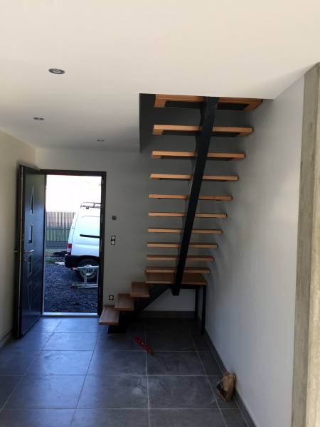 pour la réalisation de cet escalier notre client nous a demandé un ouvrage le plus fin possible afin de ne pas perdre de place dans son hall d'entrée tout en gardant le design et le charme de la maison .