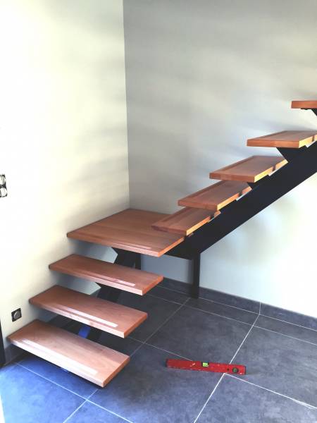 - limon central en tube rectangulaire. - des marches en hêtre claire afin de garder la clarté offerte par les puits de lumière à l’étage - un garde corps tubulaire avec une finition inox - 1 palier de repos - la finition de l'escalier est thermolaquée cuit au four pour avoir un rendu parfait