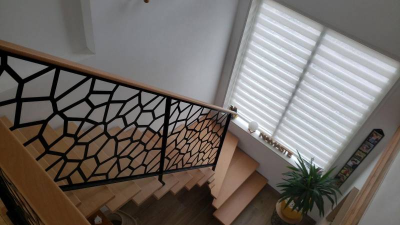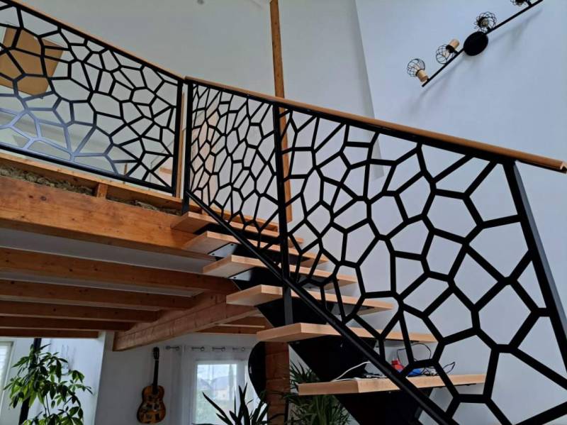 Escalier 1/4 tournant avec limon métallique, tube central diamètre 160x80mm, marches en bois hêtre clair vernis et garde-corps rampant et droit sur la mezzanine, avec découpe laser d'un arbre de vie.