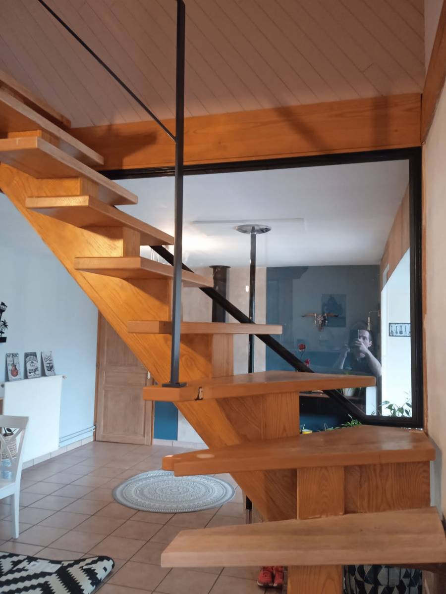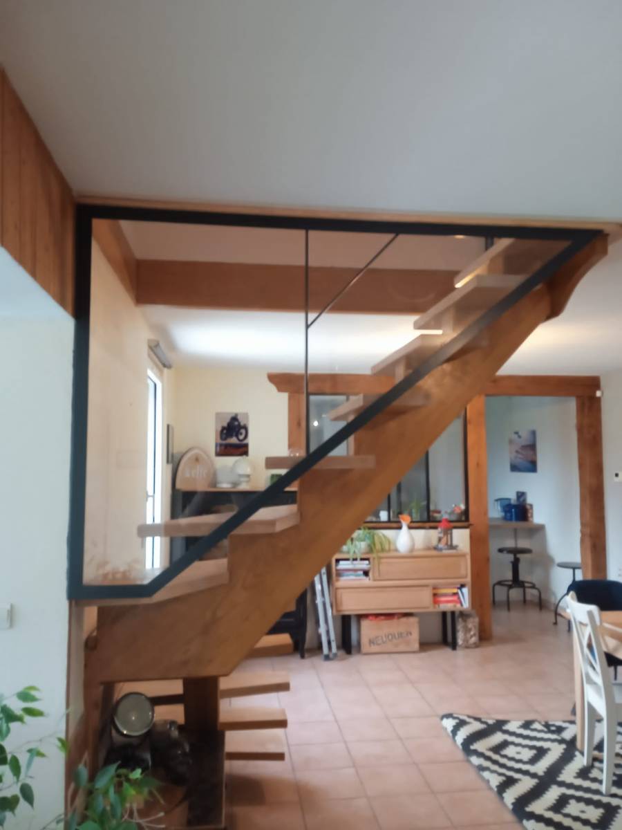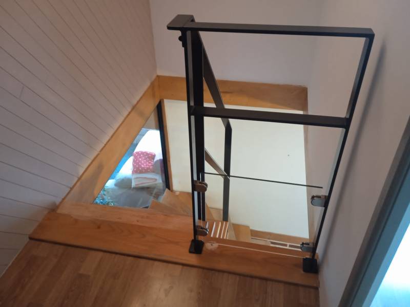 Réalisation d'un garde-corps rampant sur escalier composé d'une main courante, d'une lisse intermédiaire et d'un vitrage en triangle, et d'un garde-corps sur palier, avec vitrage en remplissage.