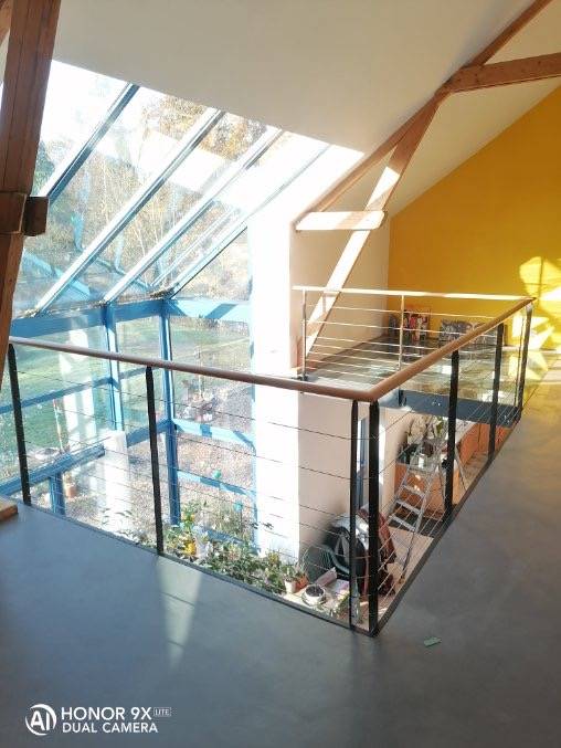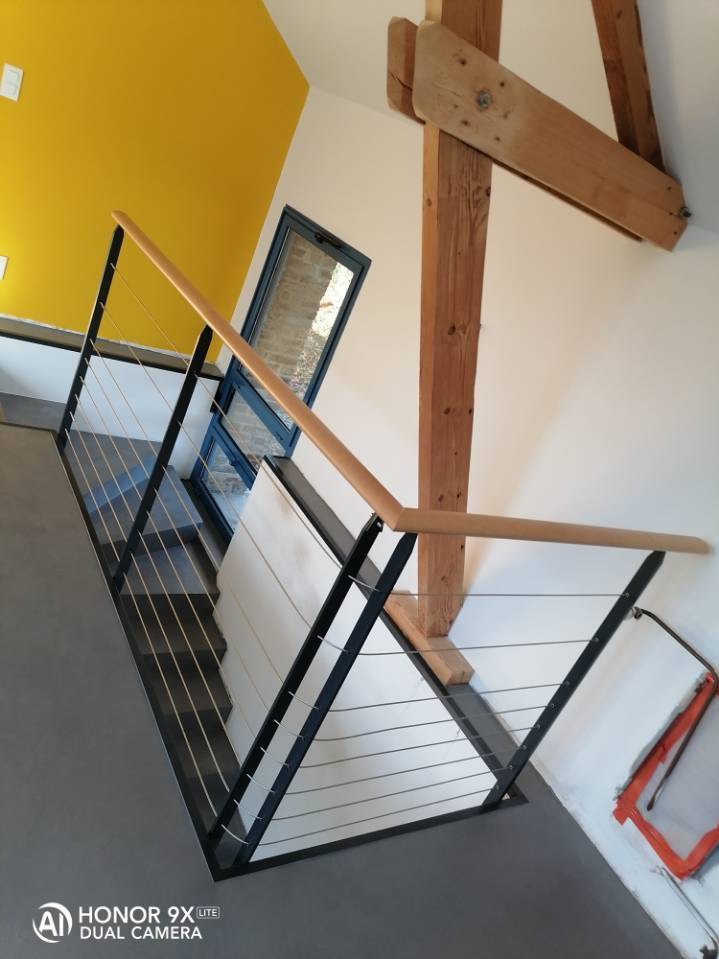 La société SM Bâtiment est intervenue chez ce client, proche de LE HAVRE (76600). Nous avons réalisé dans nos ateliers ce garde-corps en acier galvanisé, sur nez de dalle poteaux en plat galvanisé avec câble inox et main courante en hêtre. Le garde corps a été installé à l'anglaise par notre équipe poseur.
