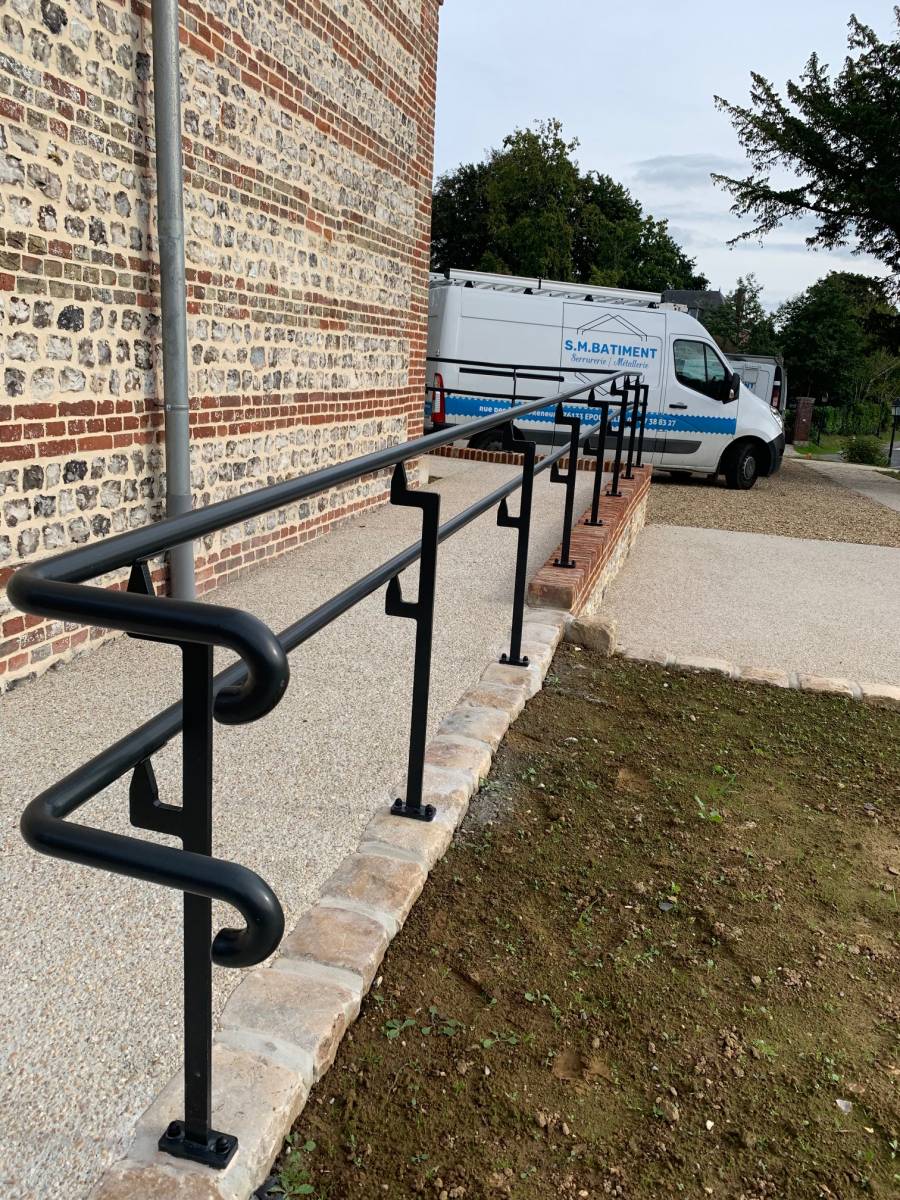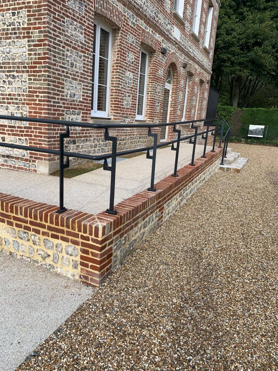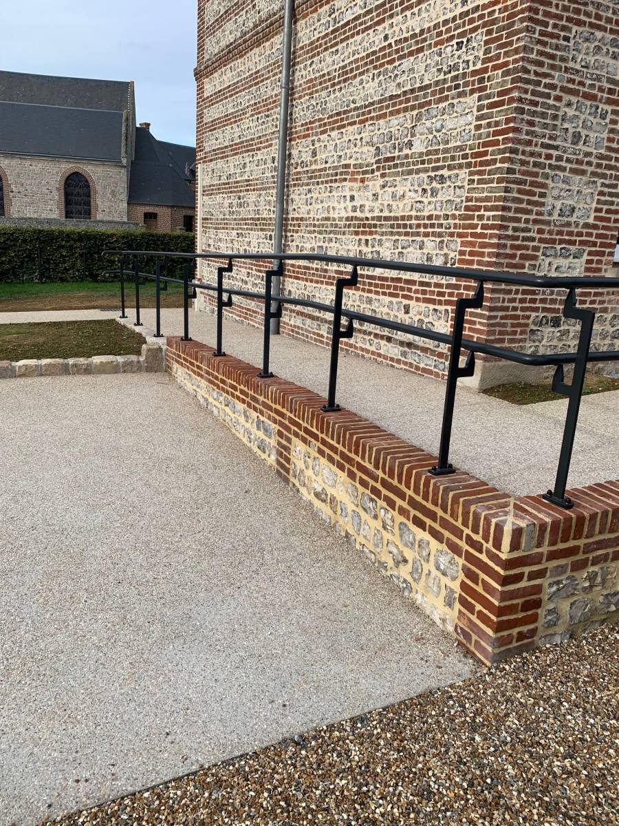 Réalisation de mains courantes sur mesure sur rampe d'accès extérieur pour la commune de Manneville-ès-Plains.