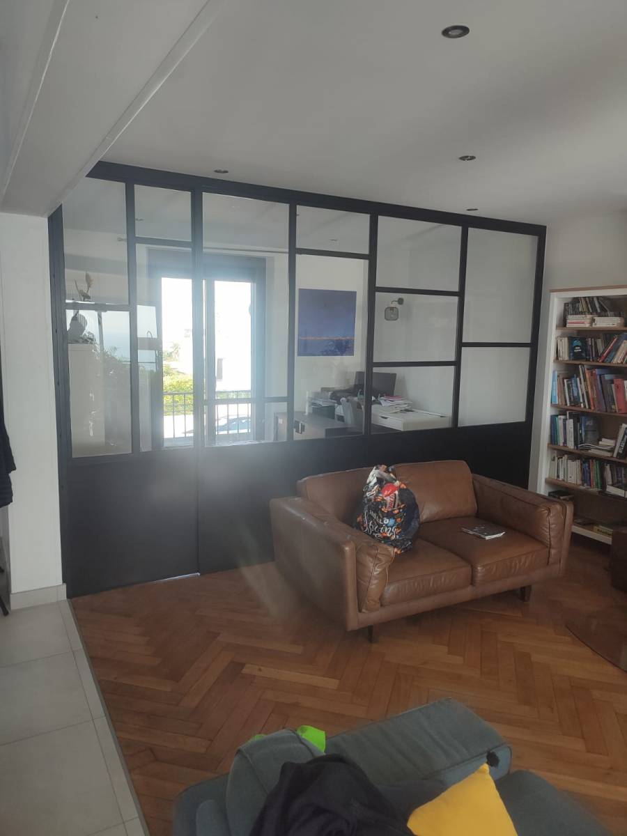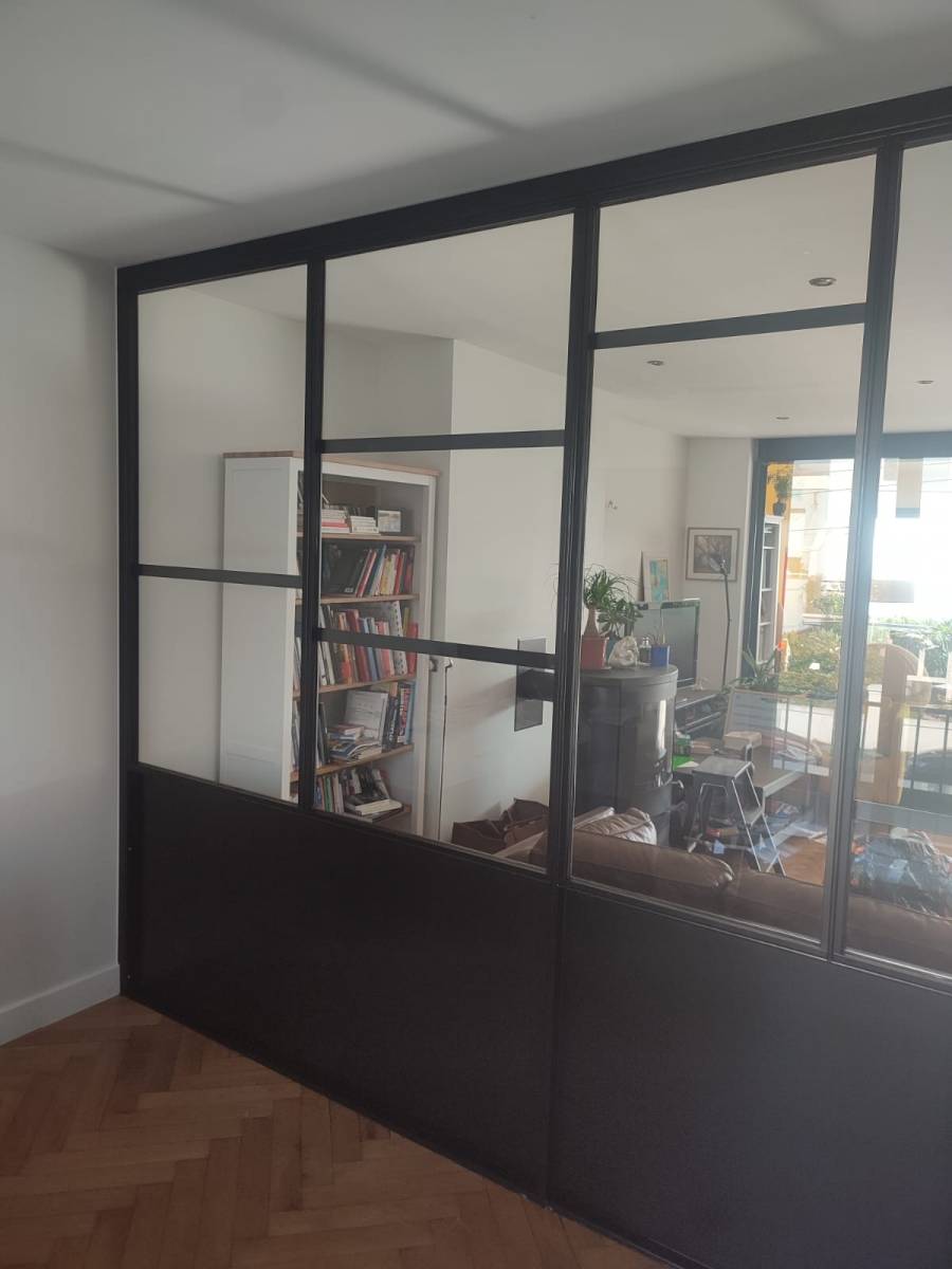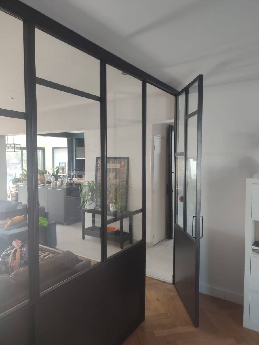Pour notre client situé à proximité de St Adresse (76310), nous avons fabriqué et posé une verrière de séparation de pièce ainsi qu'une porte identique, avec cadre périphérique en cornière, vitrage sécurité et un sous bassement de 85cm.