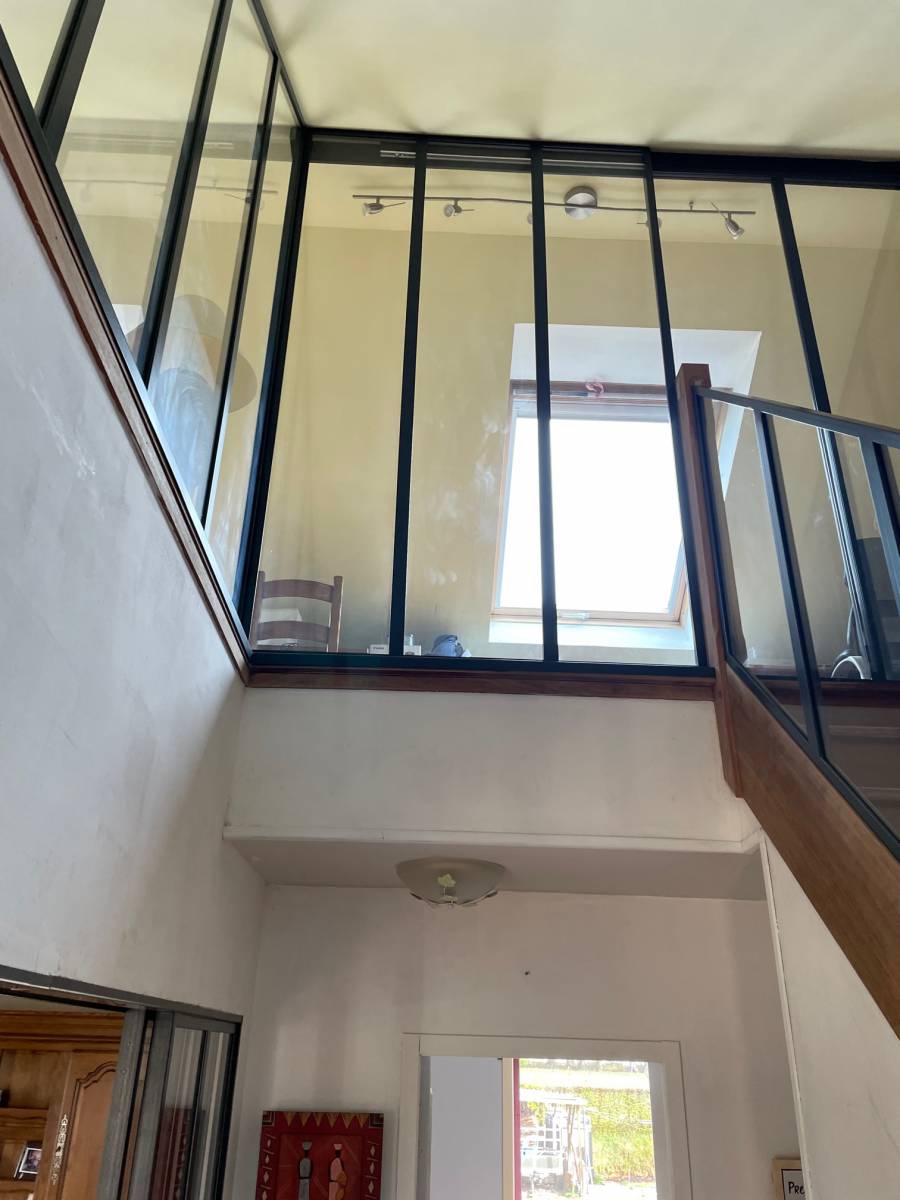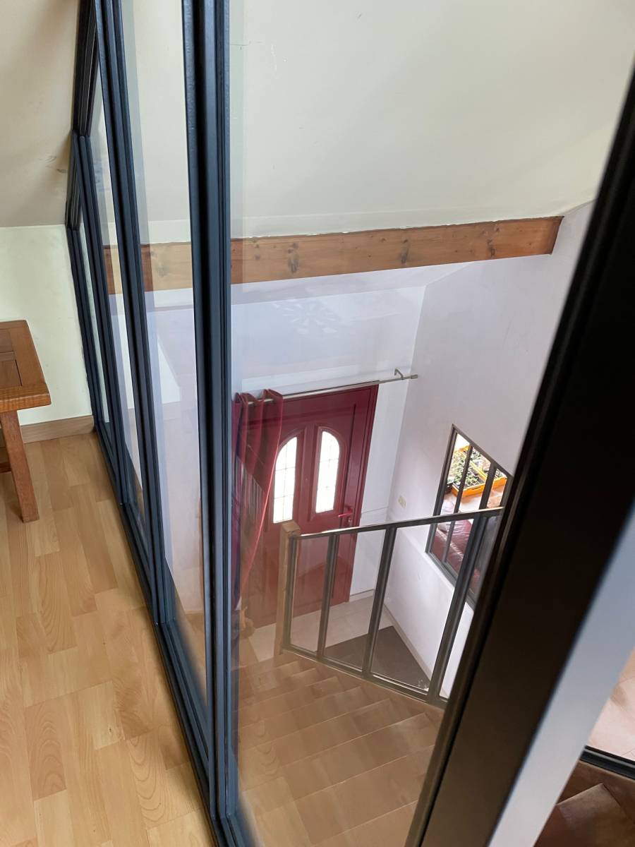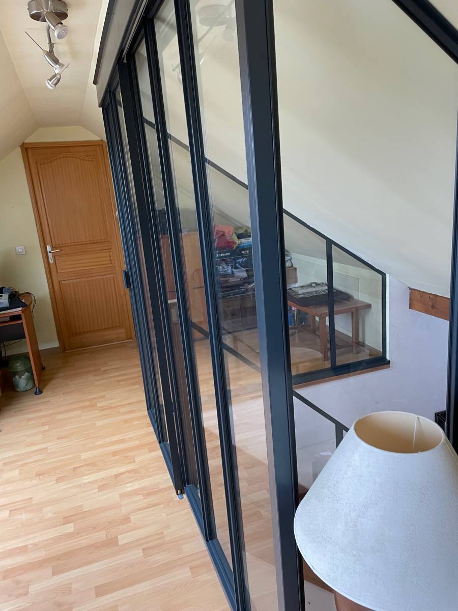 Nous avons créé sur mesure dans nos ateliers 2 parties fixes pour chaque coté de l'escalier et une porte coulissante. Notre équipe de poseurs procède ensuite à l'installation chez notre client.