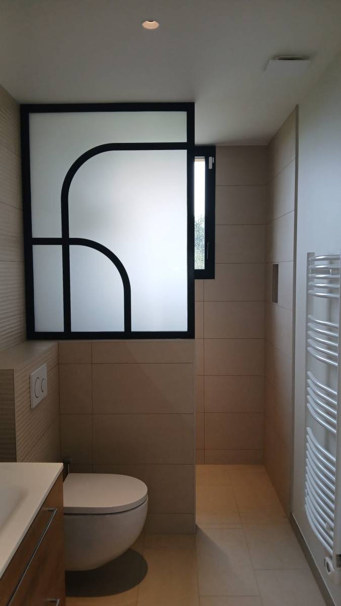 Pour notre client situé à proximité de Manéglise (76133), nous avons fabriqué et posé une verrière de séparation de pièce, avec cadre périphérique en cornière et vitrage sécurité ainsi qu'une verrière posée sur un appuis placo, vitrage flute.